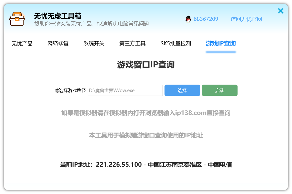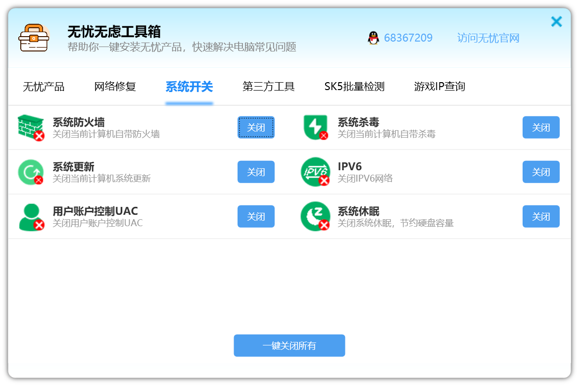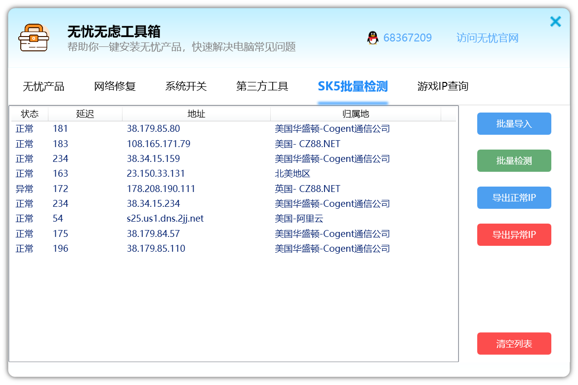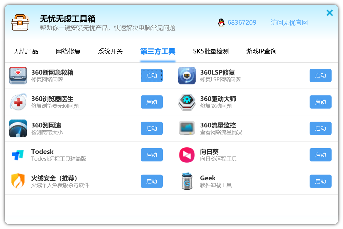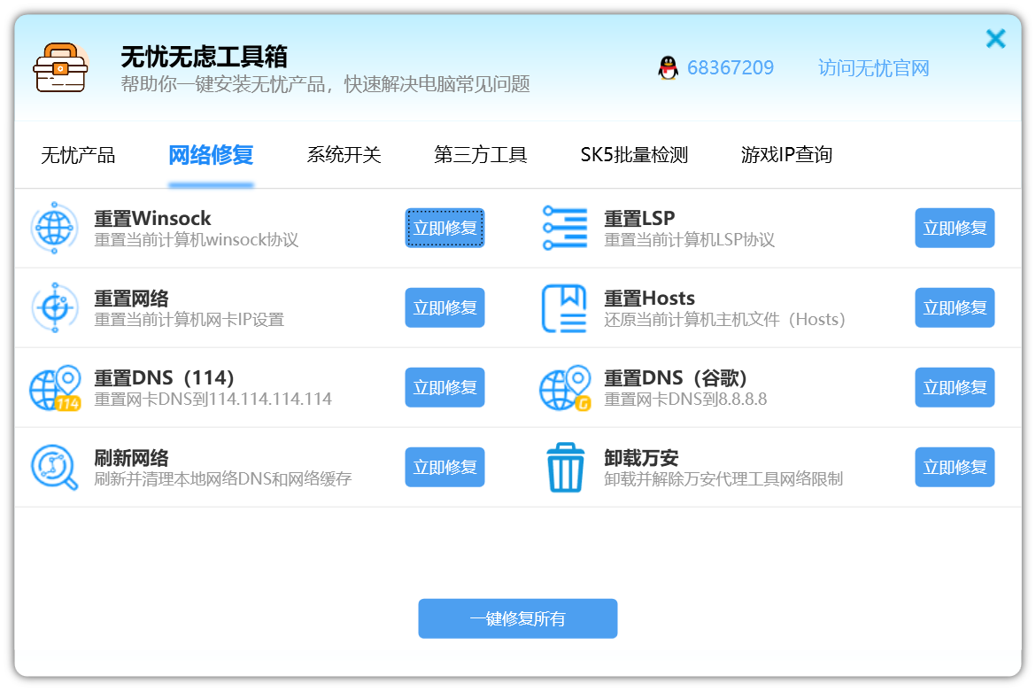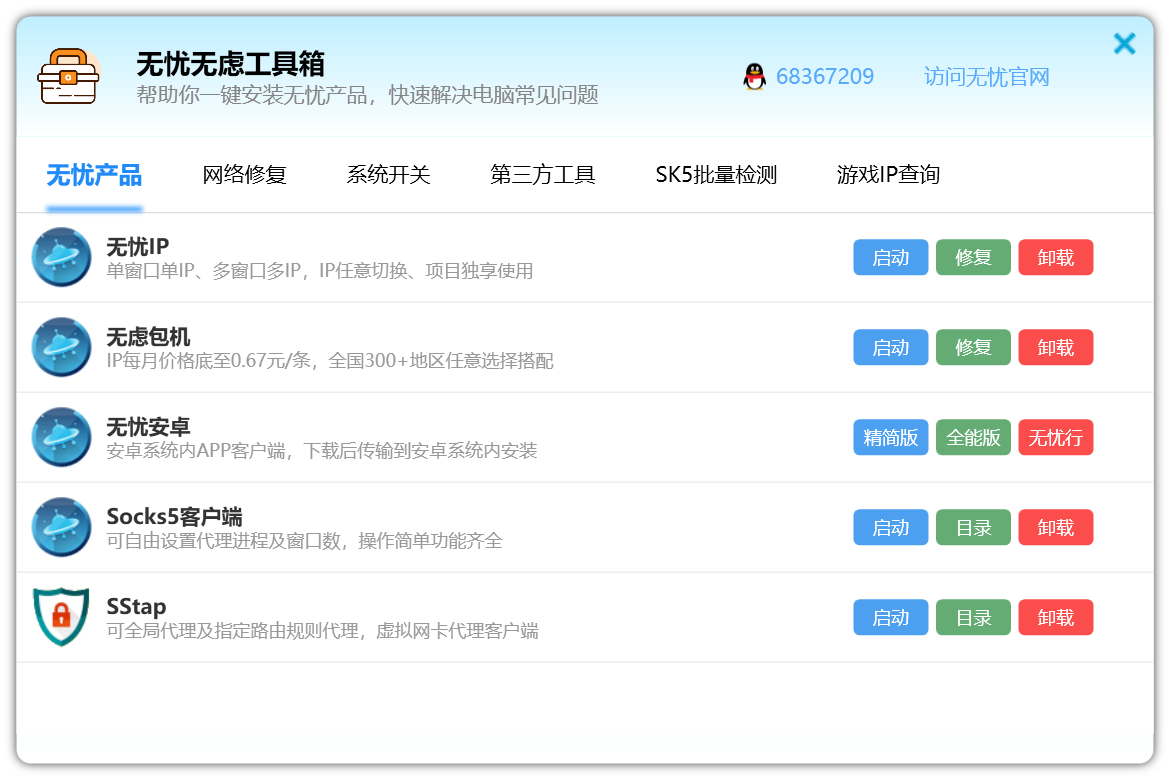 无忧工具箱 大小:7.02MB 下载量:324 更新时间: 2025-06-20 支持平台:所有Windows系统 本地下载 百度网盘下载 软件展示 软件介绍 一键安装、修复、卸载无忧产品,修复网络问题,解决电脑常见问题。 新增: Socks5批量检测 端游窗口IP查询 自动在线更新。