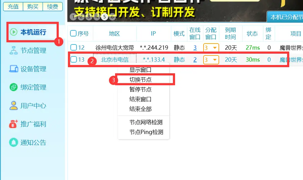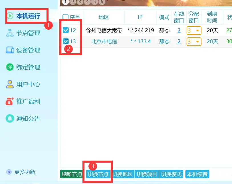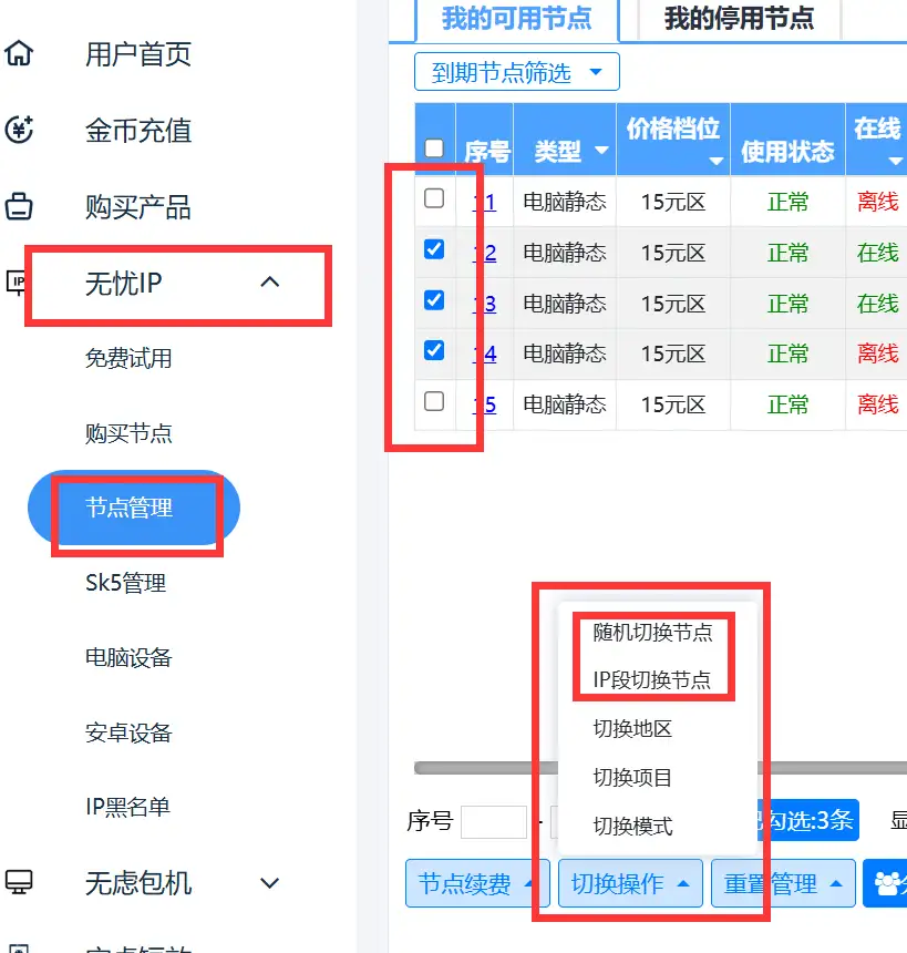 勾选需要切换的节点,点击下方 切换节点 就可以了。