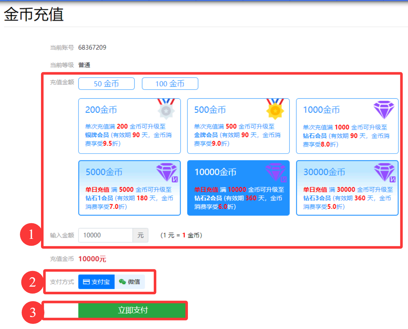 单日充值 满 10000 金币可升级至 钻石2会员 (有效期 360 天,金币消费享受6.0折)