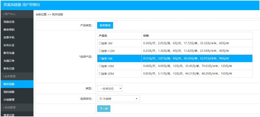 2、  购买安卓动态线路:使用安卓版APP,登录软件使用,可每次连接切换不同的ip地址,也可以一直使用该ip。该套餐同样也是独享线路,在选择的游戏项目中,为唯一独享使用。