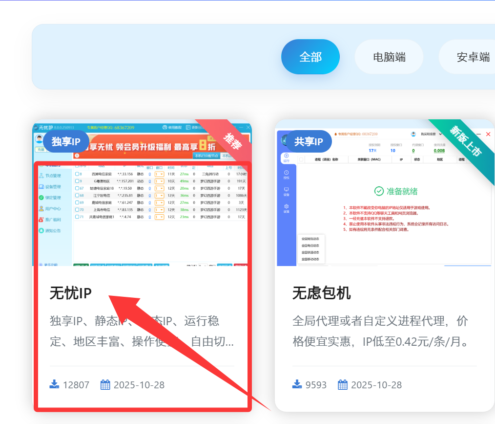 如果要进入不同产品的登录或注册页面,按照下方步骤操作,右上角默认登录及注册的是“无忧IP”。