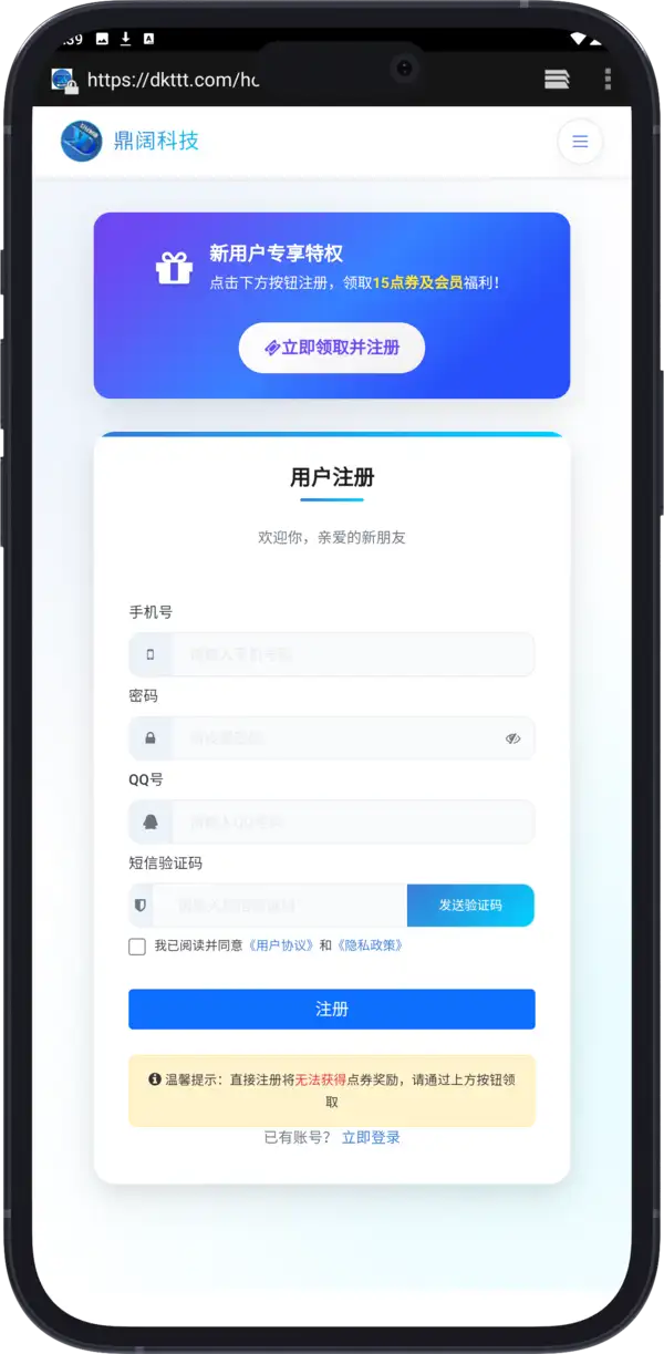 按照要求填写手机号、密码、QQ号,点击 发送验证码,查看手机短信,把验证码填进去,点击注册就可以了。