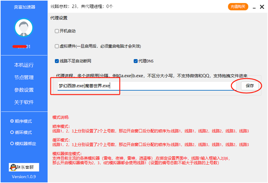 2、 设置游戏进程,将需要代理的游戏图标拖进进程框,并保存。