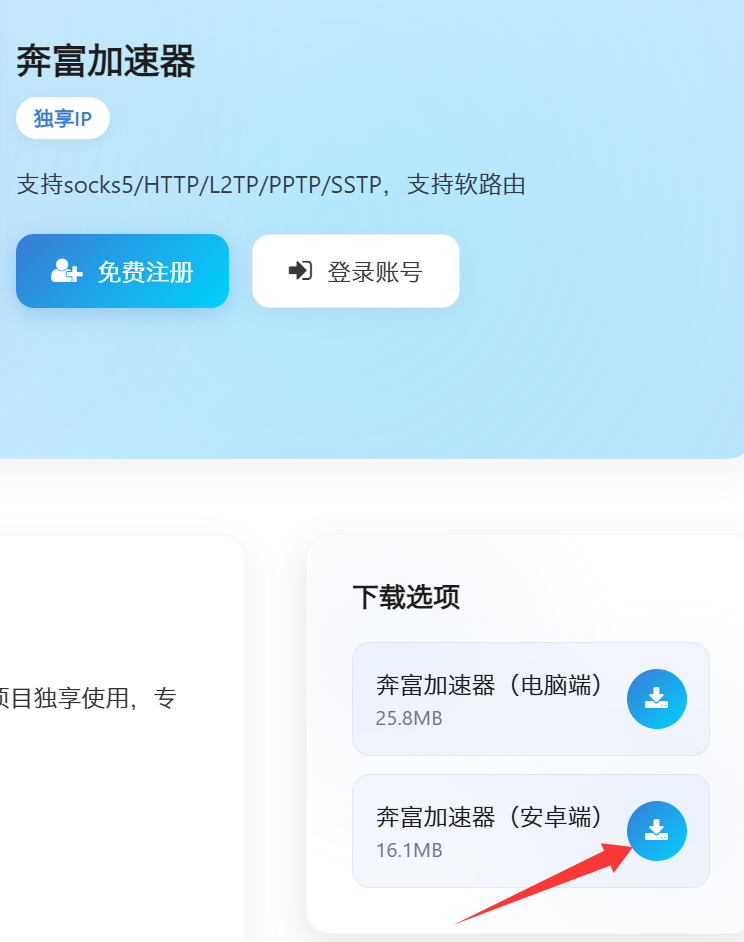 在现在选项里, 选择 奔富加速器(安卓端) 点击后面的下载图标开始下载。